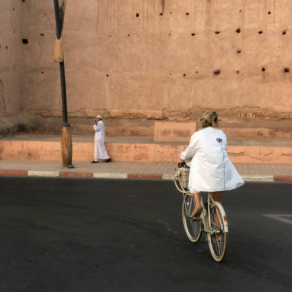 Hoe zien haar dagen in Marrakesh eruit als de reizigers vertrokken zijn en zij alle vrijheid heeft? Caroline lacht: “Ik verveel me nooit! Ik hou ervan om op mijn fiets door de stad te gaan. Te stoppen als ik een bijzonder winkeltje spot. Ik kom hier nu al jaren en ook voor mij heeft Marrakesh nog onontdekte plekjes. Laatst liep ik een winkeltje binnen met allerlei kleding voor mannen. De eigenaar zelf zag er zo verzorgd en prachtig uit, ik was diep onder de indruk. Alles wat deze man verkocht was handgemaakt in de prachtigste kleurencombinaties. Dit soort ontmoetingen maakt me dankbaar én geeft me energie en inspiratie.” Zelf laat Caroline ook allerlei moois maken, voor haarzelf, haar gasten en voor de riad. Van kussenhoezen tot sieraden en zelfontworpen jurken. Hiervoor gaat ze op jacht in de souks. Inmiddels heeft ze zo haar vaste adresjes, waar ze kralen, stoffen en andere mooie materialen koopt. “Ik kom vaak bij een verkoper die me dan de sleutel van zijn opslag geeft. Dan mag ik op eigen houtje zoeken in die enorme stapels naar mooie stoffen waarvan ik dan kussenhoezen of een sprei laat naaien. En in een winkel waar ze antieke sieraden verkopen, zoek ik de kralen uit voor mijn collectie kettingen en armbandjes. Die laat ik dan maken door een jonge Marokkaanse vrouw die hiermee weer een klein inkomen verdient.”