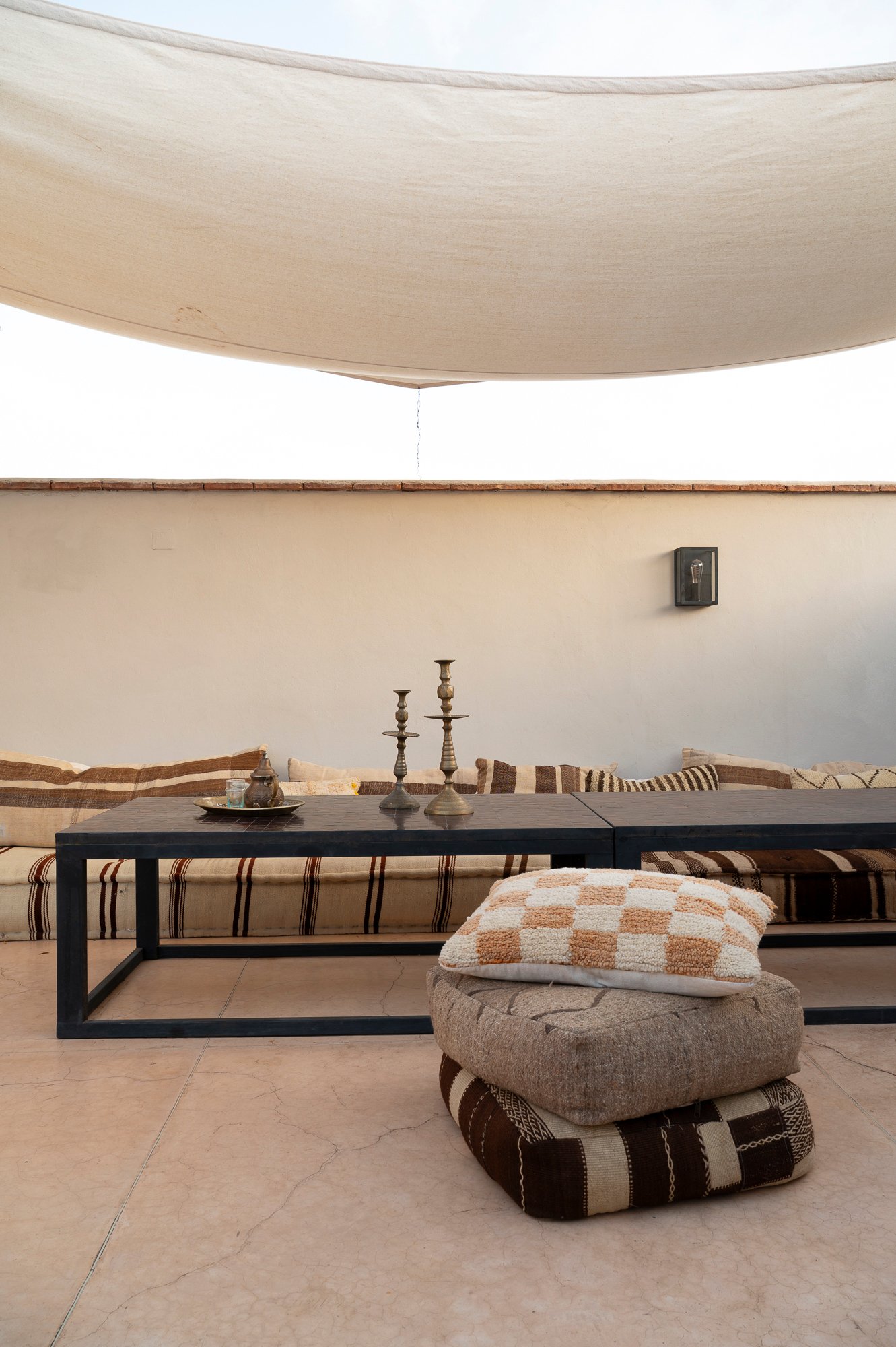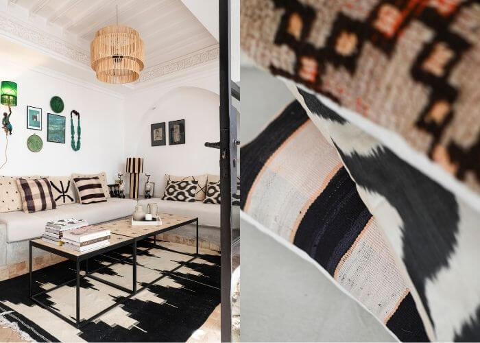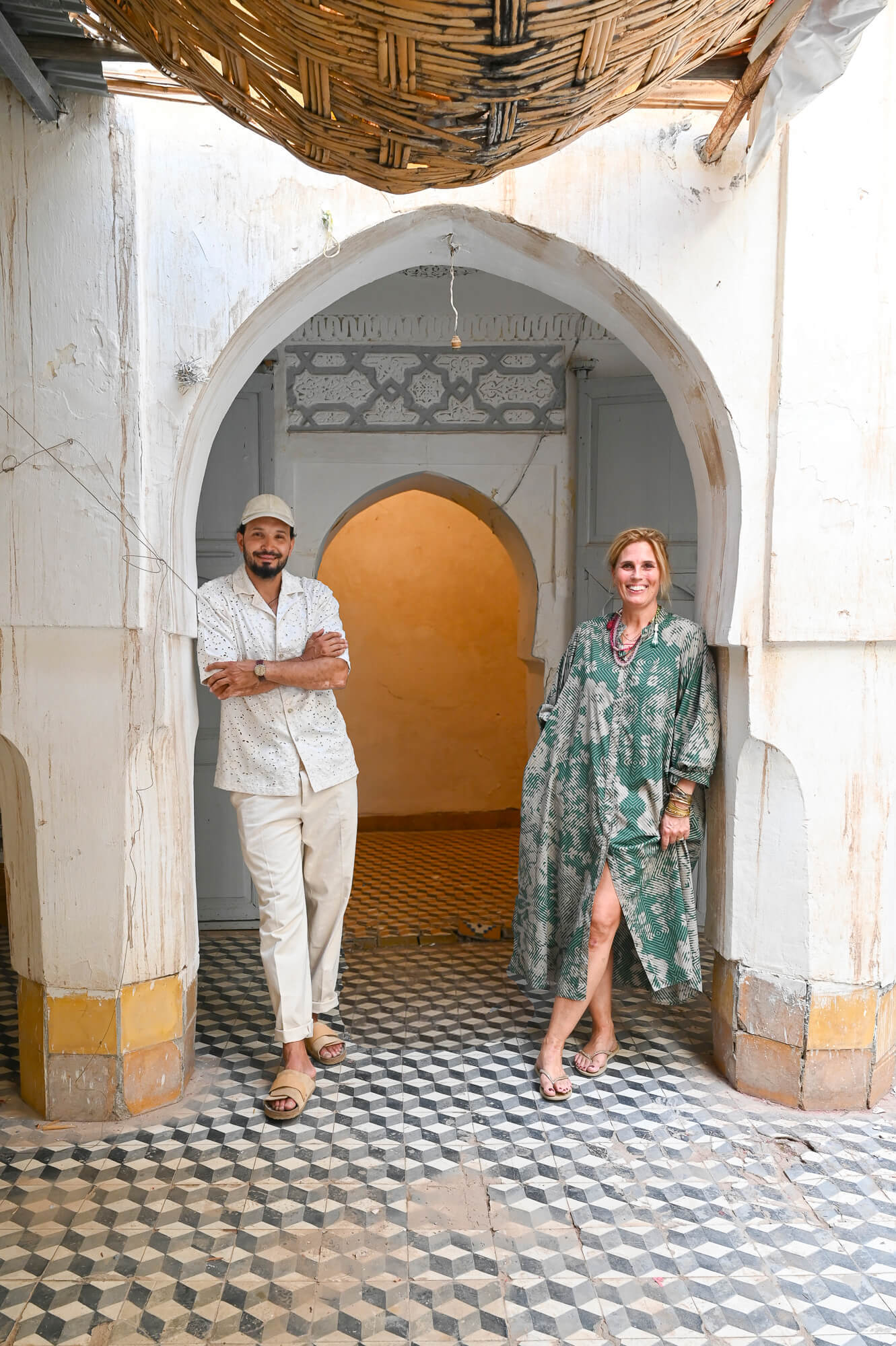 Maar laten we eerst even teruggaan naar het begin, naar het jaar 2020, als de wereld op slot gaat vanwege de coronapandemie. Caroline heeft eerder al een paar yogareizen naar Marokko georganiseerd. De deelnemers brengt ze onder in mooie hotels, een regeling die prima werkt. En ze bezit op dat moment, samen met een vriendin, een huis in Alkmaar dat ze verhuren. Ze besluiten het te verkopen en de winst elders te investeren. Maar het bedrijfspand dat ze in eerste instantie op het oog hebben, laat Carolines hart niet sneller kloppen. In overleg met haar zakenpartner besluit ze om iets anders te doen met haar deel van het geld. Want is het niet ontzettend handig om een eigen plek in Marrakesh te hebben waar haar reisgezelschappen en zij én haar gezin zelf kunnen verblijven? Gedurende een aantal maanden struint ze het Marokkaanse Funda af en spot daar uiteindelijk een pand dat haar bevalt. Gids Jalil is haar hulp ter plekke en bekijkt het voor haar. De riad is nog maar een paar jaar oud, bouwtechnisch tiptop in orde, alleen wel erg traditioneel qua looks. “De inrichting was totaal niet mijn smaak, veel donker hout en rode kussens”, vertelt Caroline. “Ik hou juist van licht en naturel. Maar ik zag meteen voor me hoe prachtig dit kon worden.”